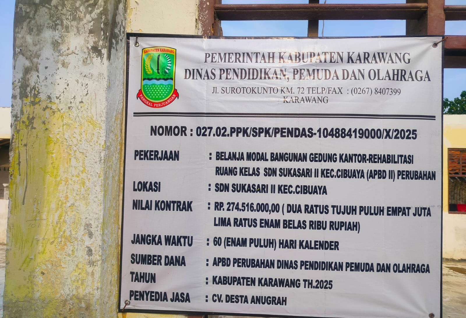 Proyek tersebut tercatat dalam papan informasi sebagai Belanja Modal Bangunan Gedung Kantor – Rehabilitasi Ruang Kelas SDN Sukasari II (APBD Perubahan) yang dikelola Dinas Pendidikan, Pemuda dan Olahraga Kabupaten Karawang Tahun 2025, dengan nilai kontrak Rp 274.516.000 dan masa pelaksanaan 60 hari kalender. Adapun pihak penyedia jasa adalah CV Desta Anugrah.
