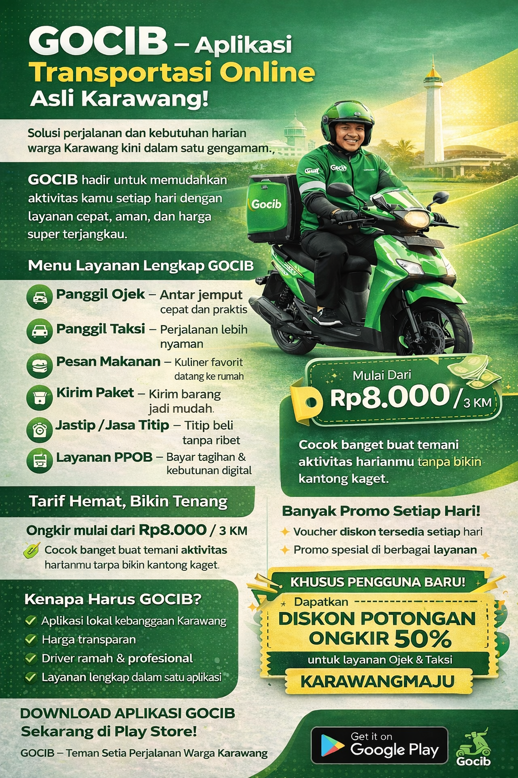Karawang – Kabar baik bagi masyarakat Karawang dan sekitarnya. Kini telah hadir GOCIB, aplikasi transportasi online karya anak daerah yang siap memudahkan berbagai aktivitas harian masyarakat dengan layanan lengkap, harga terjangkau, serta promo menarik setiap hari.