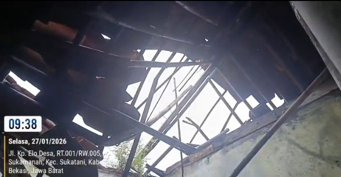 Kabupaten Bekasi – Sebuah rumah milik pasangan lanjut usia di Kampung Elo RT 01/05, Desa Sukamanah, Kecamatan Sukatani, Kabupaten Bekasi, Jawa Barat, ambruk pada bagian atap dan kini dinyatakan tidak layak huni, Selasa (27/1/2026).