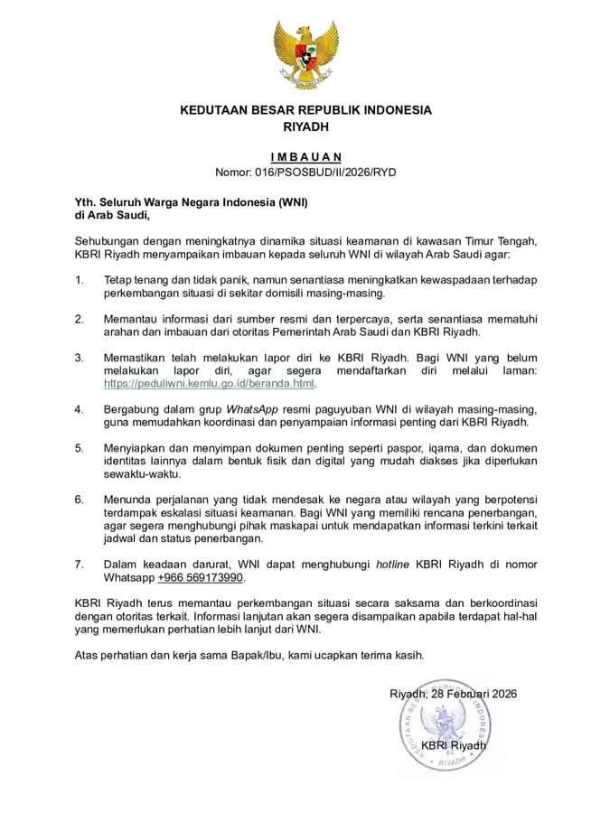 Riyadh, 28 Februari 2026 — Meningkatnya dinamika keamanan di kawasan Timur Tengah mendorong Kedutaan Besar Republik Indonesia (KBRI) Riyadh mengeluarkan imbauan resmi kepada seluruh Warga Negara Indonesia (WNI) di Arab Saudi.